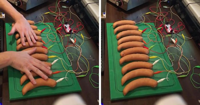 Meet Patrick from Patrick’s World, who has flexed his creativity muscle in a way that probably nobody has ever thought of. He took out some traditional German sausages, hooked them up to some wires that were connected to a number of sound equipment, and made a fully functional piano. Yes, you read that correctly.