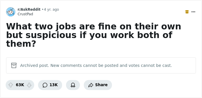 There’s a funny thread on the Internet, created a couple of years ago by the user u/CrustPad, who asked folks the question: "What are two jobs that are good on their own, but are suspicious if you work both?" It has received over 63K upvotes and about 13K different comments. Just agree, a worthy reason to collect the most interesting opinions from this thread, isn’t it?