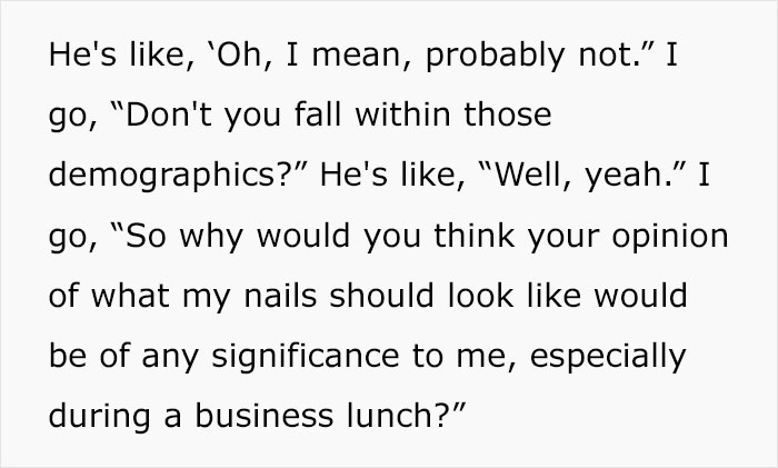InterviewKnowing how to stand up for yourself at all times is an important skill that comes in handy in various situations. Of course, that becomes hard to do when we’re presented with an uncommon situation when someone is clearly overstepping their boundaries and making us feel uncomfortable. A lot of us have probably heard how many women get harassed or even abused in various places, even those that are known to them and where they should feel comfortable. Having in mind how important it is to talk about such situations, TikTok user @duchessofdecorum decided to share her recent experience of having a business lunch with a 70-year-old man who decided it was an appropriate time to talk about the woman’s… nails. Pattie Ehsaei, who is behind this TikTok account, went viral with almost 955K views after revealing more details about how this clearly unsuccessful meeting went.