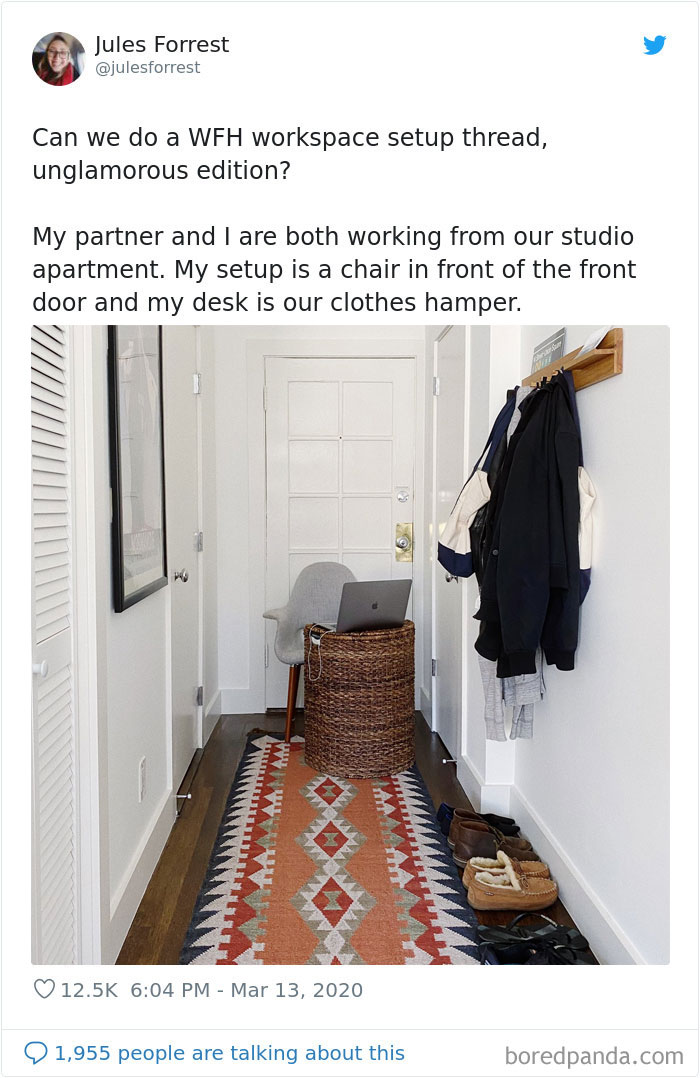 Twitter user Jules Forrest recently shared a pic of her own setup: she moved a chair into the hallway and made a desk out of her clothes hamper. Thinking she can't be the only one, Jules asked if someone else also wanted to respond with an image of their own 'unglamorous' home workspace. Immediately, creative solutions started pouring in.