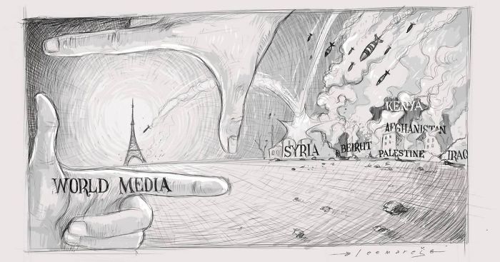 Jerameel Lu, a talented pencil artist, posted this image to criticize the media’s response to the tragic attacks that happened this weekend in Paris. As he writes on his Facebook page, “this piece is only against the almost unequal treatment of the world media on every terrorism act.” On Thursday, Beirut was also hit with double suicide bombings, and many perceive that the media was not nearly as responsive to these events as it was to those in France. (More info: Facebook)