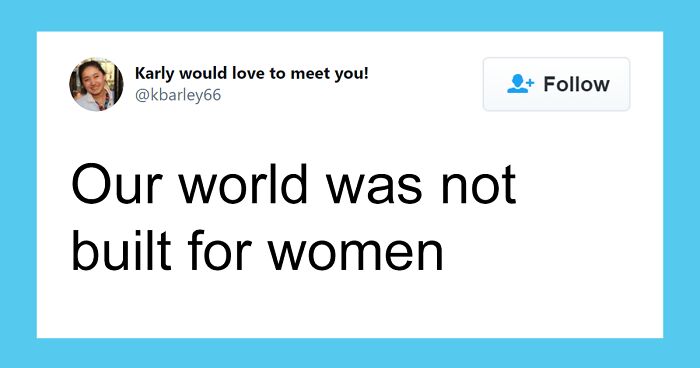 But Karly Hou, a sophomore at Harvard in computer science, math, and economics, has recently posted an illuminating thread on Twitter that has shed some light on the current state of gender bias which, in many cases, is not so obvious. “Our world was not built for women,” Karly made a strong statement before proceeding to list all eighteen disturbing examples of how it’s hostile to female identities.