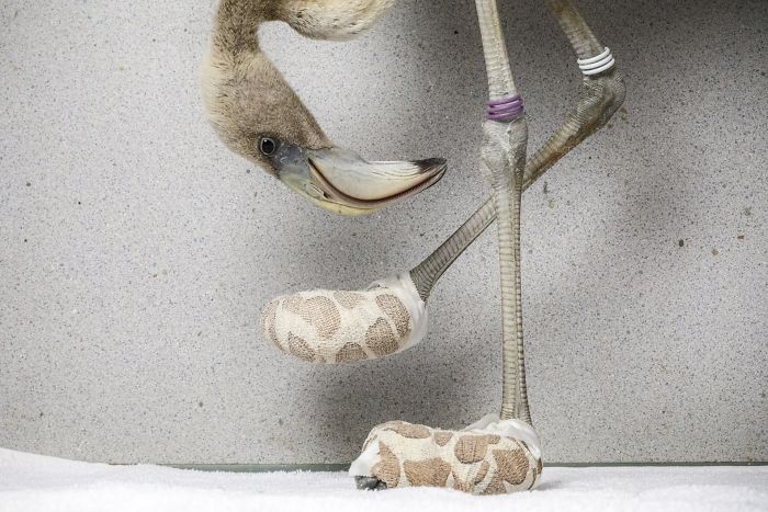Caribbean flamingo inspects the improvised socks created to help heal its severe foot lesions, at the Fundashon Dier en Onderwijs Cariben, Curaçao. The bird was brought by plane from neighboring island Bonaire, after spending a few weeks in a local rehabilitation facility. Such lesions are common among captive flamingos, as they have very sensitive feet and are used to walking on soft ground. After a few weeks of care the bird was transported back to Bonaire. There are around 3,000 breeding pairs of Caribbean flamingos on Bonaire, and a further 200 to 300 birds on Curaçao.
