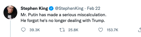 It's actually becoming like his novels. I just saw a vid where POW Russians were answering why they came 'here'. They all said that they were under the impression that they were simply doing military exercises. Nothing seemingly special till they were told they *would* fight, or possibly face being shot, since it was now considered war time. Fk Putin. Russian people, we see you trying to survive a mad man. The POWs also said they were in Ukraine for 2 wks before attacking.