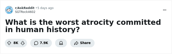 One Redditor brought up this heavy topic, asking others to share the worst atrocities humanity has ever committed—and plenty came forward with harrowing examples. Scroll down to read them, but fair warning: these accounts aren’t for the faint of heart.