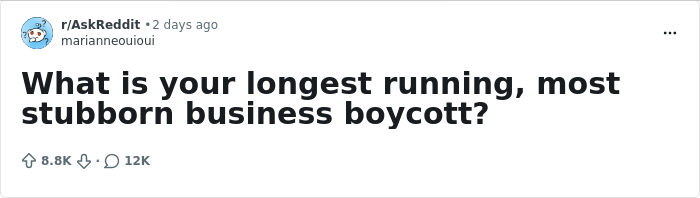 Redditors marianneouioui and istrx13 recently asked people to share which businesses they’re stubbornly boycotting and won’t spend another dime at after getting screwed over, and their responses are hilariously personal. Spoilers: more than a few of these grudges are old enough to vote. Read them below.