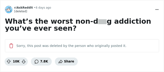 Sports betting. I watched a vp from another department at my old job lose his house, cars, wife and kids, because he couldn’t stop betting despite interventions. We are talking millions of dollars of debt.