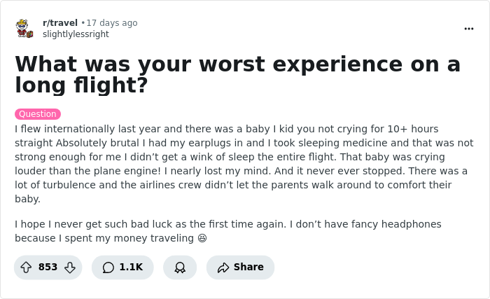 The original thread appeared in the r/travel community almost a month ago, when the user u/slightlylessright asked netizens to share their worst experiences on a long flight. Well, the thread gained comments like an airplane gains altitude, having as of today more than 1.1K different stories and discussions about them. And Bored Panda has collected 39 of the most interesting stories especially for you.