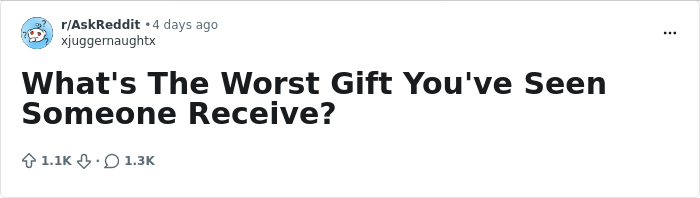 To find out how this conversation started in the first place, we got in touch with the Reddit user who invited others to share the worst Christmas presents they've ever received, Xjuggernaughtx.