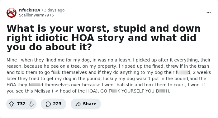 My neighborhood is a small cuál de sac community that was originally built by this one older couple that had hoped their kids and families would move into the other houses they’d built, but that never happened and all their kids live out of state. For years they were the head of the HOA for this little community. Then the wife of the couple started going around complaining about BS and claiming that we were violating this HOA rule or that regulation etc. I didn’t really give a d**n until I get a fine for letting my dog sunbathe on my front porch without a leash, with a note stating that she’s too big and violates the HOA bylaws and I have to get rid of her (dog is 40 lbs wet).