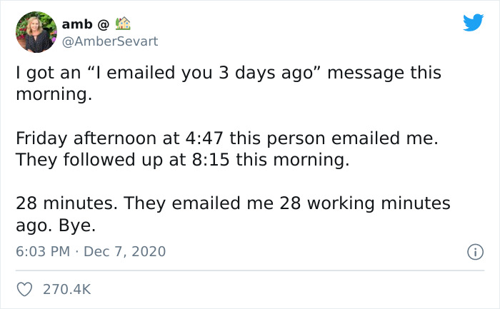 This Monday, Amber Sevart tweeted the ridiculous work-related message she received. "I e-mailed you 3 days ago," it said. Indeed, the person contacted Amber on Friday afternoon at 4:47 pm. However, they followed up at 8:15 am on Monday morning which means they technically gave her 28 working minutes to respond.
