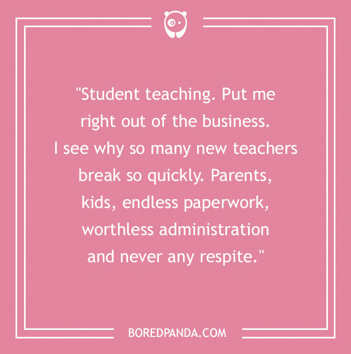"Student teaching. Put me right out of the business. I see why so many new teachers break so quickly. Parents, kids, endless paperwork, worthless administration and never any respite."