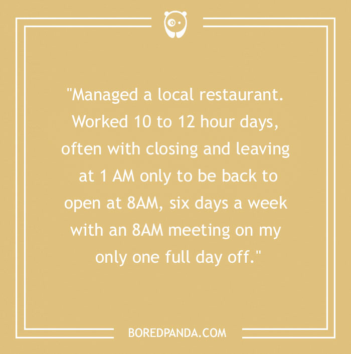 "Managed a local restaurant. Worked 10 to 12 hour days, often with closing and leaving at 1 AM only to be back to open at 8AM, six days a week with an 8AM meeting on my only one full day off."