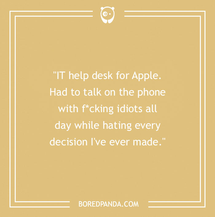 "IT help desk for Apple. Had to talk on the phone with f*cking idiots all day while hating every decision I've ever made."