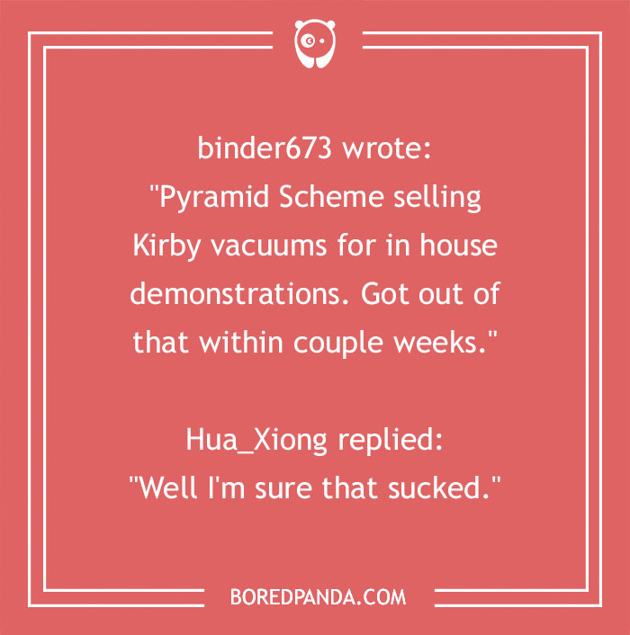 "Pyramid Scheme selling Kirby vacuums for in house demonstrations. Got out of that within couple weeks."