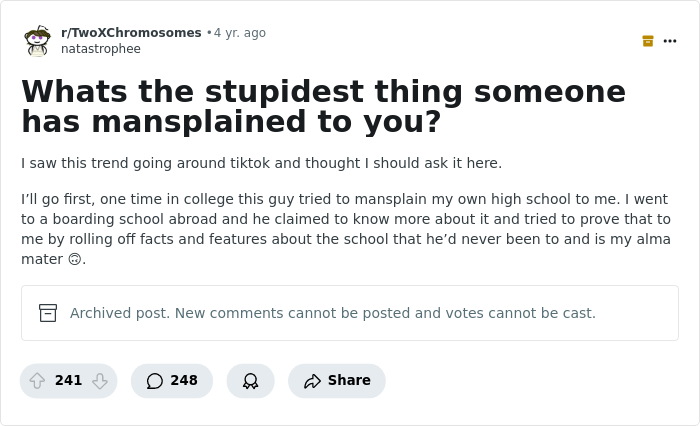 Load More Replies...As a man I can safely say not all cases of mansplining are because the other person is a woman. I have been trapped many times by men who just like to explain everything. I think it comes from being hyperfocused in their own lives that it is literally the only way they know how to communicate. And then there are the patriarchal Aholes.