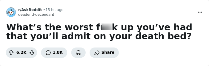 This selection of ours is based on this thread in the AskReddit community, where a couple of days ago the user u/deadend-decendant asked netizens: "What’s the worst f**k up you’ve had that you’ll admit on your death bed?"