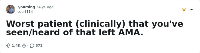 A nurse asked their peers to share the "Worst patient (clinically) that you've seen/heard of that left AMA (Against Medical Advice)," and the replies ranged from shocking to tragic: From a man who passed away shortly after his wife wheeled him out the door, seemingly against his wishes, to another who went AMA on his birthday after stating, "I’m going to go have my fun then I’ll be back, I promise” (spoiler alert: he attended his own funeral shortly after).