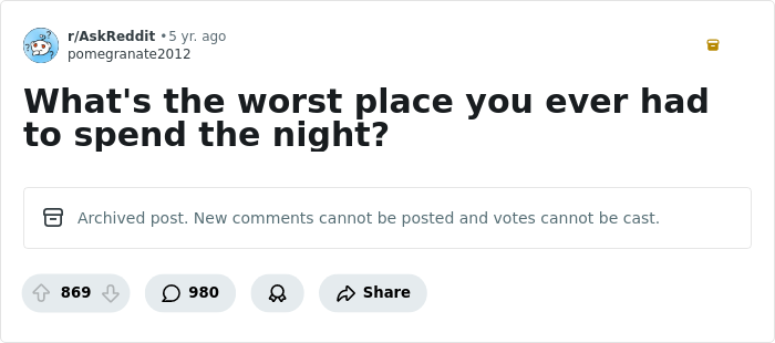 That’s why today, we’ve gathered some real-life stories from people answering, “What’s the worst place you’ve ever had to spend the night?”