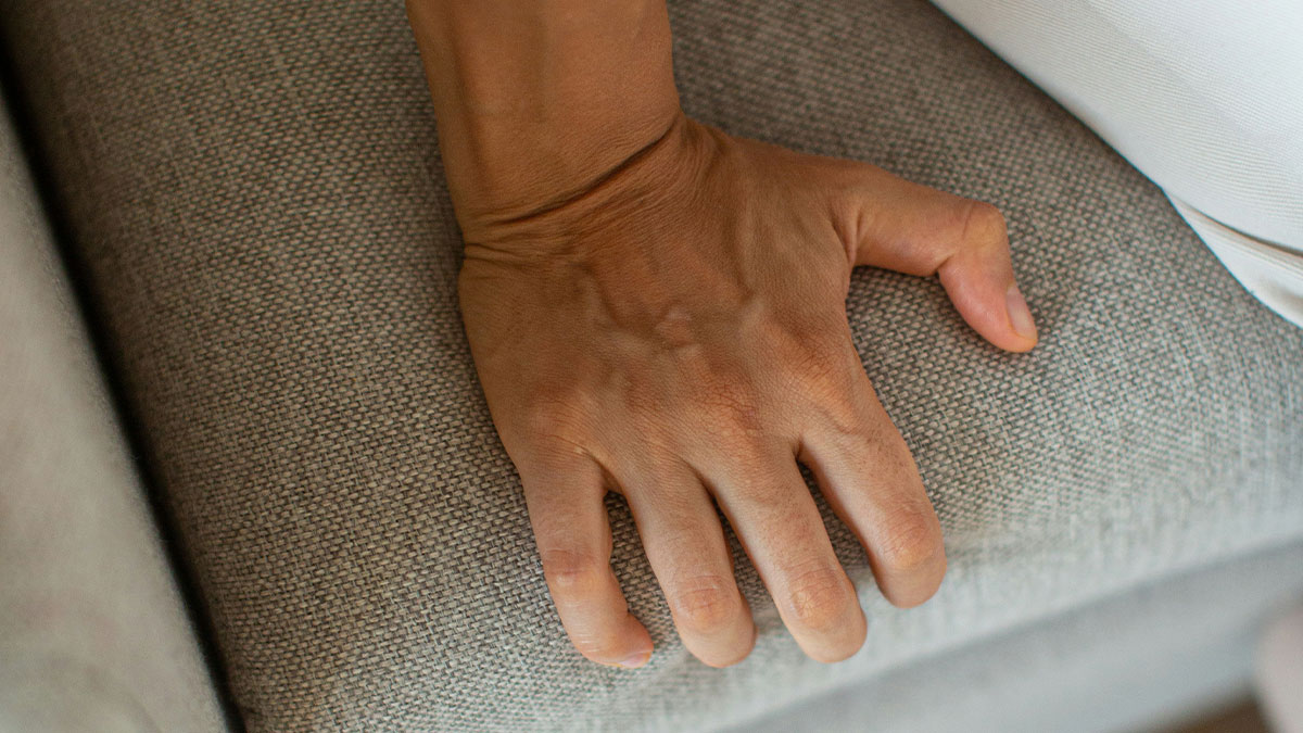 Hand gripping a seat cushion tightly, evoking the discomfort of bad plane seatmates. I (female) was flying solo from Paris to the US, I was about 20. I had just gotten my first upgrade to premium economy and I was soooooo excited!