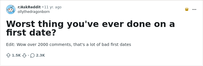 If you’ve ever endured a date so bad that you briefly considered life in a convent (or monastery), you’re not alone. People have been lifting the lid on the terrible things they, or someone else, has ever said or done during what should have been an enjoyable night out. It was all prompted by the question, "Worst thing you've ever done on a first date?"