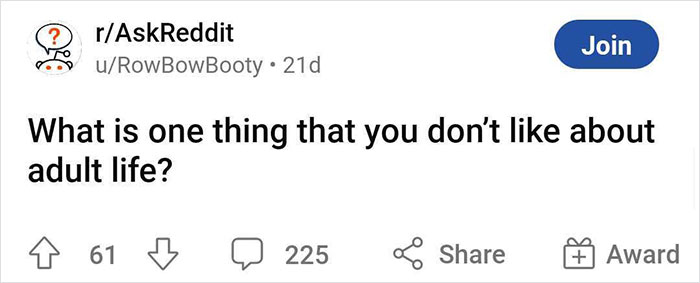Bored Panda reached out to the author of the thread, redditor u/RowBowBooty, to get their perspective about adulthood and its challenges. He was kind enough to answer all of our questions. "It’s not always a bad thing to be an adult and responsible, but it’s just not what I imagined as a kid and wanted to know how others feel about adulthood. I wanted to commiserate with those who were somewhat frustrated with adulthood like I was." You'll find our full candid interview with the author of the thread below.