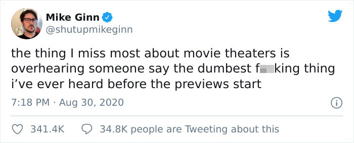 So when a guy named Mike Ginn tweeted “the thing I miss most about movie theaters is overhearing someone say the dumbest fucking thing I’ve ever heard before the previews start,” it surely rang a bell to many. People started sharing the funny things they overheard in cinema theaters and the Twitter thread soon went viral with 341.4k likes and 33.7k retweets.