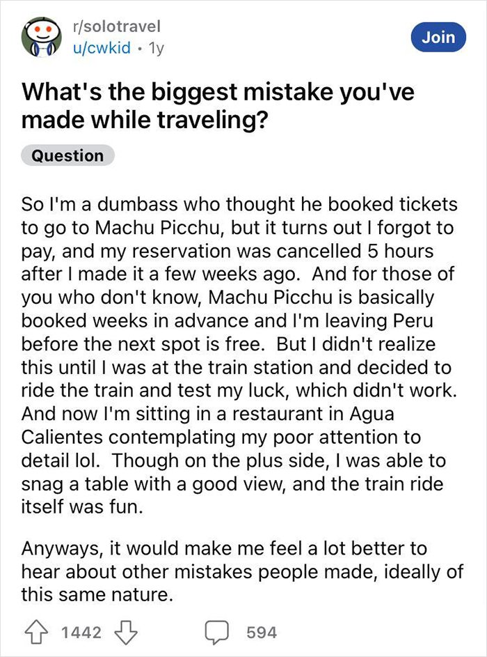 For that, there's a perfect thread. Started on the subreddit 'Solo Travel' by platform user Cwkid, it raised the question, "What's the biggest mistake you've made while traveling?" Here are some of the most popular replies.