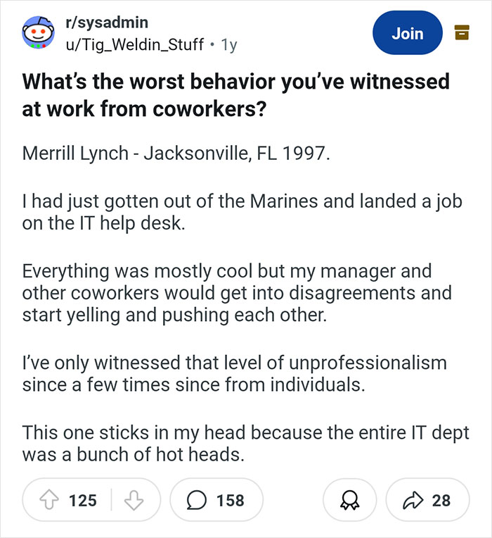 Anyone else notice how most of these 'horror stories' are mostly from tech type offices? MSP (Managed Service Provider), IT, etc?? I'm currently a full-time student, majoring in Computer Science, minoring in IT/Cybersecurity....I'm a woman...and middle age is in my rear view mirror...I wonder what kind of unhinged behavior I can expect from my future coworkers....