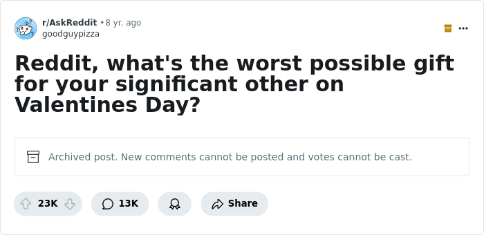 These examples are responses to a Reddit thread from years ago, which becomes relevant around the days leading up to February 14th each year. Scroll through and see which ones you can learn from.