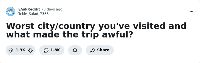 One netizen decided to ask the Reddit community what the worst countries and cities they’d ever visited were, and people were only too happy to contribute their stories of places they’d never go back to, for all sorts of unpleasant reasons.