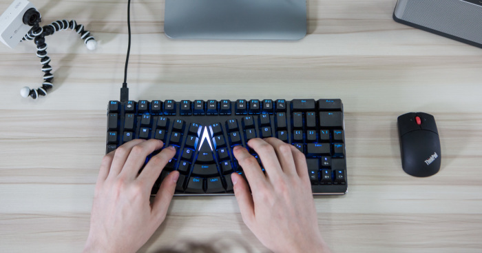 The result was X-Bows, a cross-linear ergonomic keyboard made for extended typing sessions. Angling the key columns allows for our wrists to rest at a more natural angle while we type. Moving the Enter, Backspace, Ctrl and Shift keys into the middle of the board reduces the workload on our pinkies – the weakest and most overloaded finger on a normal keyboard.