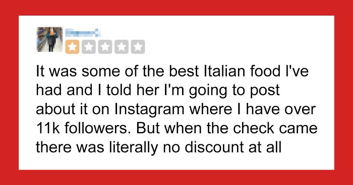 One Yelper got extremely mad after their meal wasn’t compensated. Nor were they given a discount in exchange for the promise of ‘exposure.’ See, the Yelper thought that their promise of posting that they loved the restaurant’s food on Instagram somehow entitled them to eat without paying as much as other customers. The fact that the food was divinely delicious didn’t stop them from giving the Italian restaurant a 1-star review online. Talk about sour grapes.