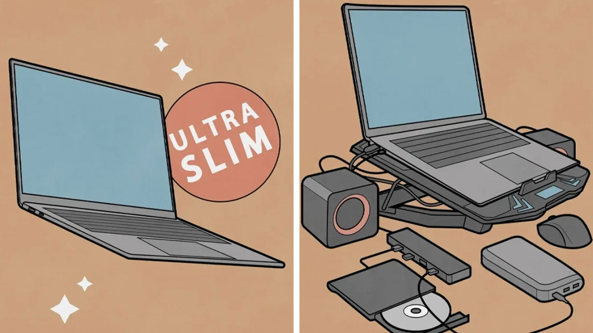 Funny yes but comic showing a slim laptop vs the same laptop with many bulky accessories attached.