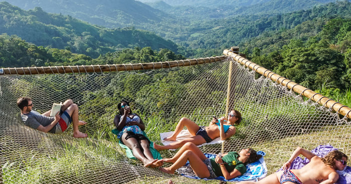 The one larger stationary hammock was built just below a deck and jutted out over a steep slope so it felt like you were suspended in the air over the valley. Another hammock slightly smaller was built to function as a swing, so multiple people could lie on it and sway up and down as long as you like.