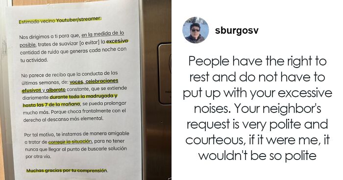 Load More Replies...Wow. Keeping neighbours awake (three nights) and then knocking on every door to find out who asked you to let them sleep: I'd look on that as threatening. I'm imagining, (as a woman), reacting when a male neighbour knocked on my door and saying "Did YOU leave that note in the lift?" 😶😮 I have a neighbour like that (LOUD) - separate house, thank God - who seems to think no one will be disturbed by their frequent noise throughout the night. Don't be an AH. Stream in the day, or find a house/cabin to live in alone.
