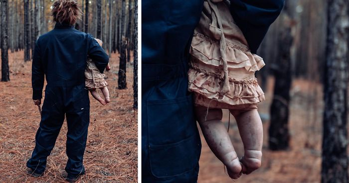 “So I took the baby, Oakley, to visit family in Oregon — my home state — that hadn’t met her yet. While there, my best friend took some pictures of her and me for a little mommy-daughter shoot. My husband being funny when I got home said in the whiniest voice, ‘I didn’t get any daddy and daughter shoot.’ So my mind went to thinking. In the meantime, I had been tagged in some horror-themed pictures, saying it was right up my alley. Daniel gets tagged in every Michael Myers video on the net because he wears his mask all the time being funny. I wanted an original photoshoot idea, something unique.”